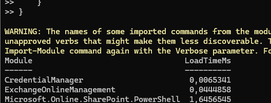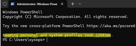 В этом примере видно, что процессу PowerShell потребовалось 12 секунд на загрузку. Что довольно много. Такое сообщение автоматически выводится, если время загрузки профилей PowerShell превысило 500 мс.