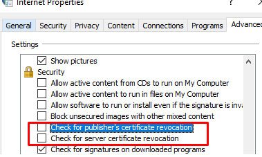 -> Advanced –> Check for publisher (server) certificate revocation.