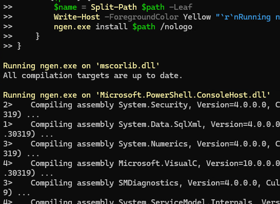 Если вы подозреваете, что причиной медленного запуска powershell.exe являются медленная работа библиотек .NET Framework, можно скомпилировать все используемые сборки (assemblies) в нативный машинный код с помощью утилиты ngen.exe (Native Image Generator). Это существенно увеличит производительность приложений .NET, включая PowerShell:$env:PATH = [Runtime.InteropServices.RuntimeEnvironment]::GetRuntimeDirectory()