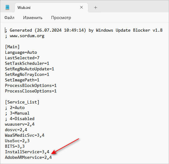 - Откройте файл «Wub.ini» и удалите строку с этой службой.