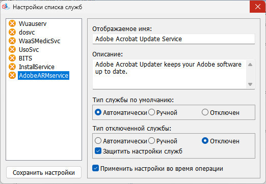 | Защитить настройки служб | Предотвращает сброс настроек системой или другими программами |