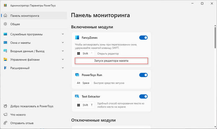 - В окне настроек приложения включите модуль «FancyZones», а потом нажмите «Запуск редактора макета».