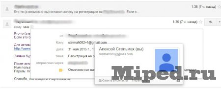 2) Теперь когда вы укажите эту почту (с +1 в конце или +*любоеслово*) — на вашу почту (основную, miped@gmail.com) придет сообщение о подтверждение регистрации (если оно требуется) или оповещение о том, что вы зарегистрировались.
