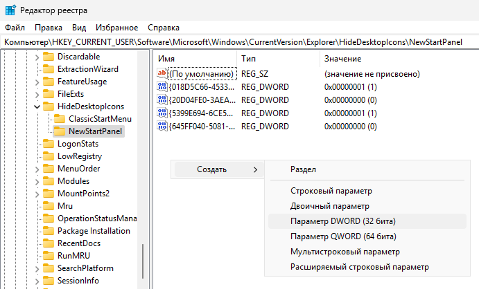 HKEY_CURRENT_USERSoftwareMicrosoftWindowsCurrentVersionExplorerHideDesktopIconsNewStartPanel