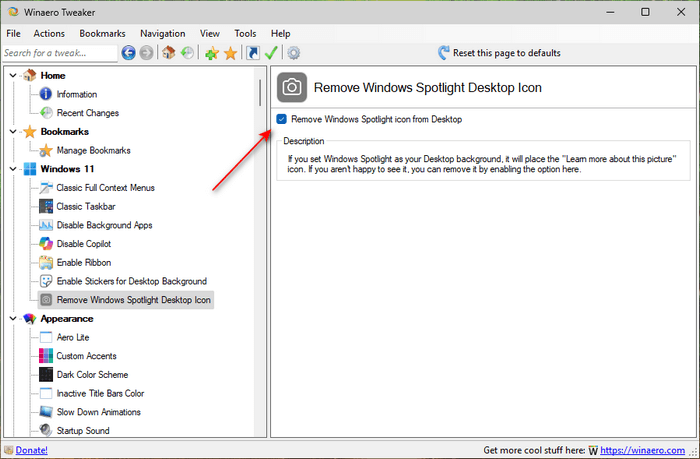 - Установите флажок в опции «Remove Windows Spotlight Desktop Icon».