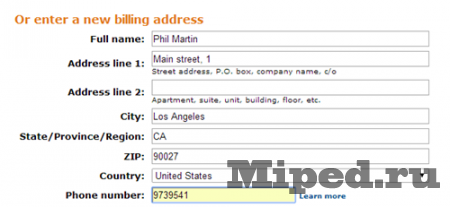 5) Заполняем адрес и пр. (код доступен только для жителей Америки, поэтому забиваем в гугле любой город США и его почтовый индекс)