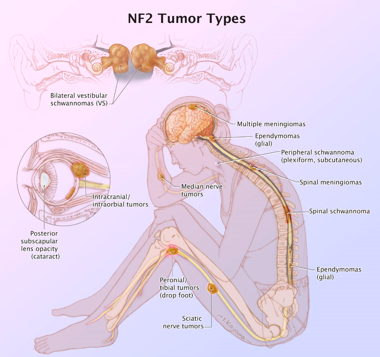 Neyrofibromatoz genetik kasallik sifatida ota-onalardan farzandlarga o’tadi. U autosom-dominant yo‘l bilan nasldan naslga o‘tadi, ya’ni agar ota yoki onada ushbu gen mavjud bo‘lsa, farzandda uni meros qilib olish ehtimoli 50 foizni tashkil qiladi. Neyrofibromatoz uch xil shaklda uchraydi: Neyrofibromatoz tip 1 (NF1), Neyrofibromatoz tip 2 (NF2) va Shvannomatoz. Har bir turining genetik sababi va klinik belgilari farq qiladi. NF1 holatlari ko‘proq uchraydi va odatda bola hayotining dastlabki yillarida aniqlanadi. Ushbu turdagi kasallik NF1 geni mutatsiyasi tufayli yuzaga keladi. NF2 esa NF2 genidagi o‘zgarishlar bilan bog‘liq bo‘lib, u asosan vestibulyar shvannomalar — eshituv nervlariga yaqin joylashgan o‘simtalar bilan bog‘liqdir. Shvannomatoz esa eng kam uchraydigan tur bo‘lib, u ham asosan og‘riqli shvannomalar bilan namoyon bo‘ladi.